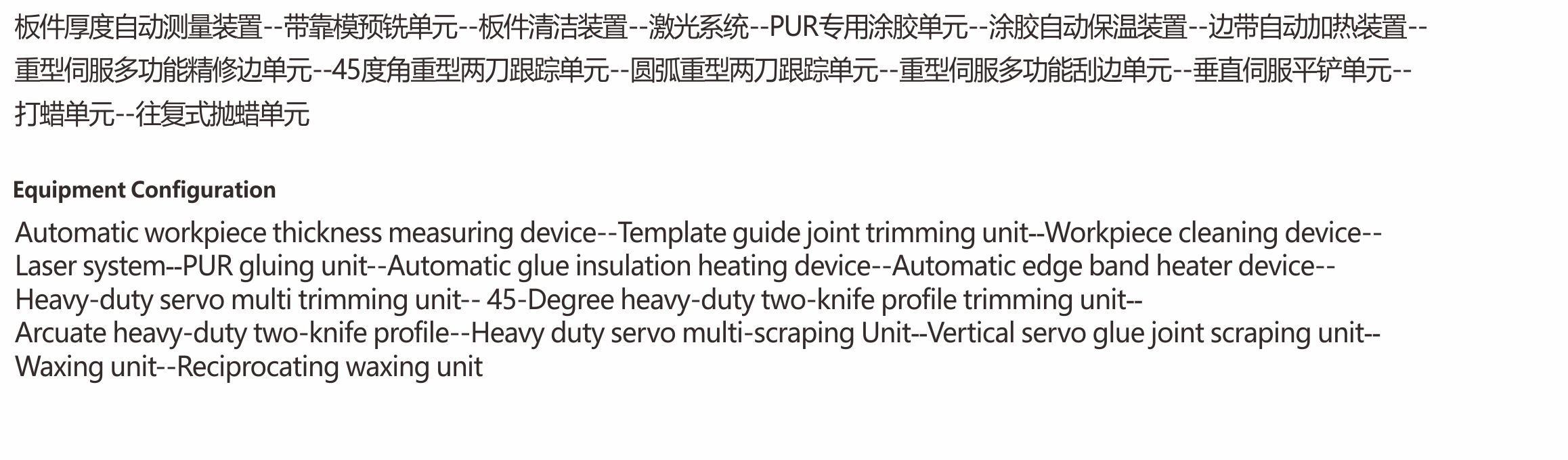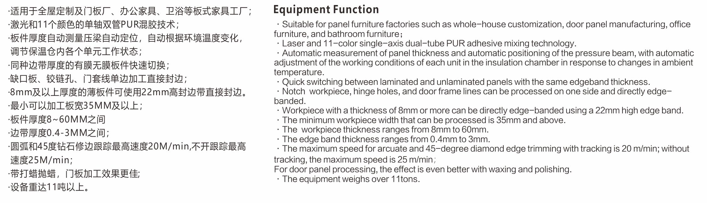·适用于板式全屋定制及办公家具工厂门板、柜体的PVC、ABS、亚克力、木皮等封边材质,宽度在35MM及以上,厚度8~60MM之间的板件加工。 ·自动测量调节压梁高度,板件基材待涂胶面彻底清理后涂胶,避免涂胶轴上频繁出现残渣导致涂胶不均匀从而影响封边效果;送带和压贴伺服驱动各个单元工作精度高,修边、刮刀、平铲单元垂直伺服调节,能够实现封边带厚度误差的垂直加工量的快速校正,有膜无膜板件快速切换及不同膜厚度的快速自动补偿。可以实现圆弧修边跟踪和45度钻石修边跟踪的快速切换和混合加工,加工速度最高可达 25M/min,重型两刀跟踪最高速度可达20米M/min,可以一次完成板件的直线封边和后续打蜡抛蜡保护。 ·自带恒温房的激光封边系统,免去客户自己搭空调房的高能耗、高成本及移动设备位置改变空间布局的不便,同时减少占地空间,可以实现对激光封边带的无缝封边完美加工。 ·一组单轴双管多色PUR专用免清洗涂胶系统,可以根据不同的板件基材快速自动调节对应合适涂胶量,具备夏季胶水快速降温,冬季板材、胶水、封边带及加工过程自动加温保温功能,为 PUR 不同气候温度下正常工作保驾护航。 ·机架采用加厚钢板焊接制作,经过退火铣平处理,上下钢梁且下钢梁及导轨与机身一体化设计精度更高,单元设计重型化长期工作稳定性更高,拥有多项国家专利技术,电气零部件采用国际国内知名品牌,保证设备运行持续稳定,加工品质完美。 ·重达11吨以上的大型设备。