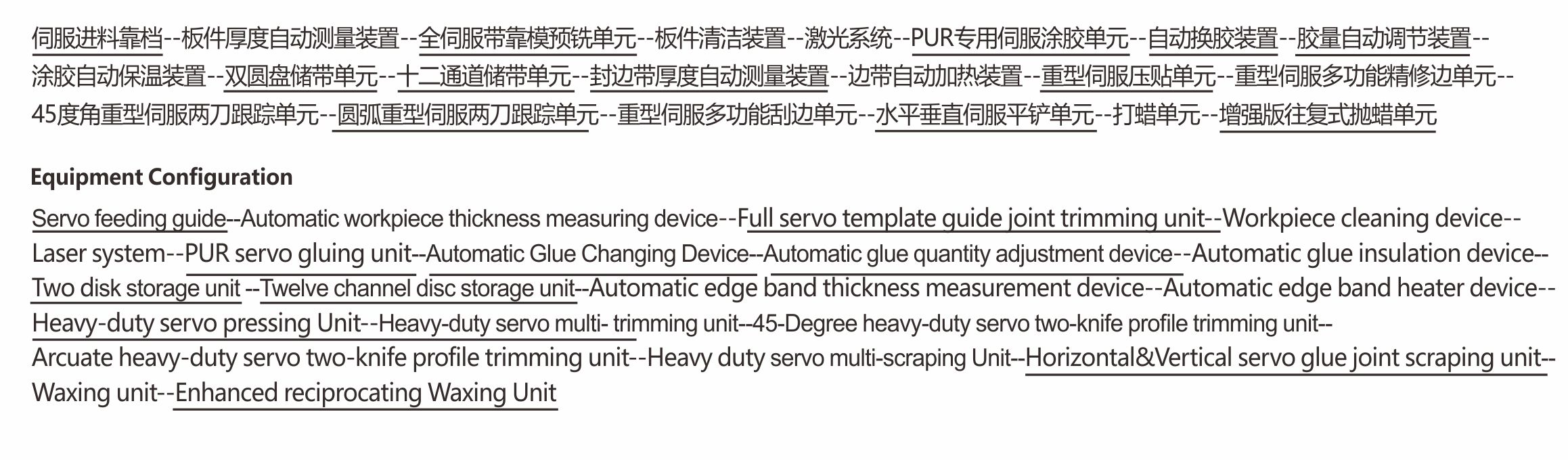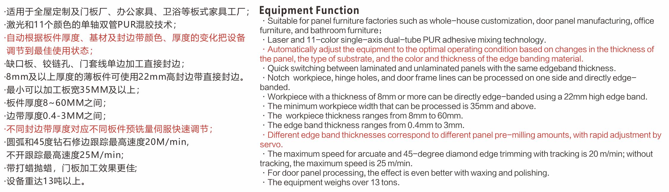 ·适用于板式全屋定制及办公家具工厂门板、柜体的PVC、ABS、亚克力、木皮等封边材质,宽度在35MM及以上,厚度8~60MM之间的板件加工。 ·自动测量板件厚度误差变化,调节最合适的压梁高度;封边带厚度自动测量,根据封边带厚度变化自动调节压贴、修边、跟踪、刮刀、平铲等各个单元的工作量;预铣单元刀具水平和垂直都伺服调节,大大提高了预铣刀使用寿命和工作效率;进料靠档、预铣、送带压带、压贴、修边、跟踪、刮刀、平铲、抛光、抛蜡等单元伺服快速调节。板件基材待涂胶面彻底清理后涂胶,避免涂胶轴上频繁出现残渣导致涂胶不均匀从而影响封边效果,送带压贴各个单元工作精度高,有膜无膜板件快速切换及不同膜厚度的快速自动补偿。同时也可以快速切换成45度钻石修边跟踪倒角或者圆弧钻石混合加工,加工速度最高可达25M/min,重型伺服两刀跟踪最高速度可达20米M/min,可以一次完成板件的直线封边和后续打蜡抛蜡保护。 ·自带恒温房更加节能先进的第二代豪田激光封边系统,免去客户自己搭空调房的高能耗、高成本及移动设备位置改变空间布局的不便,同时减少占地空间,可以实现对激光封边带的无缝封边完美加工。 ·一组单轴双管多色PUR专用伺服免清洗涂胶系统,可以根据封边带的颜色变化自动切换最合适的胶水颜色,根据不同基材的变化实时调节涂胶量大小。具备夏季胶水快速降温,冬季板材、胶水、封边带及加工过程加温保温功能,为PUR不同气候温度下正常工作保驾护航。 ·机架采用加厚钢板焊接制作,经过退火铣平处理,上下钢梁且下钢梁及导轨与机身一体化设计精度更高,单元设计重型化长期工作稳定性更高,拥有多项国家专利技术,电气零部件采用国际国内知名品牌,保证设备运行持续稳定,加工品质完美。 ·重达13吨以上的大型设备。