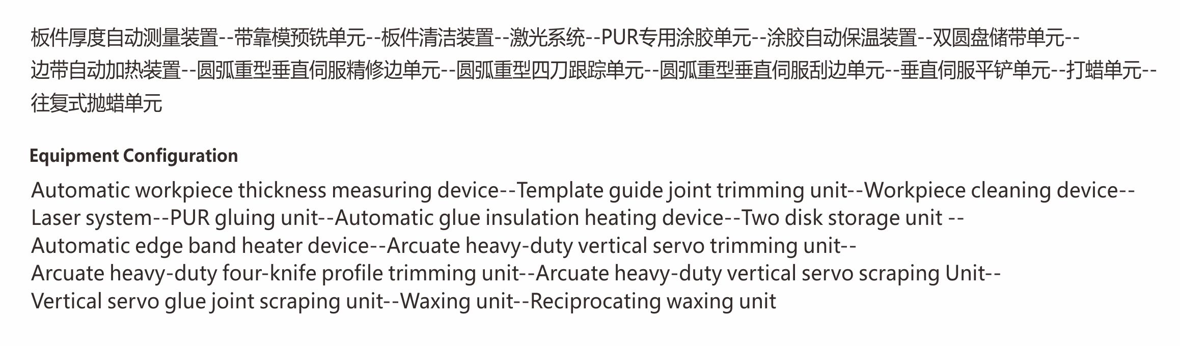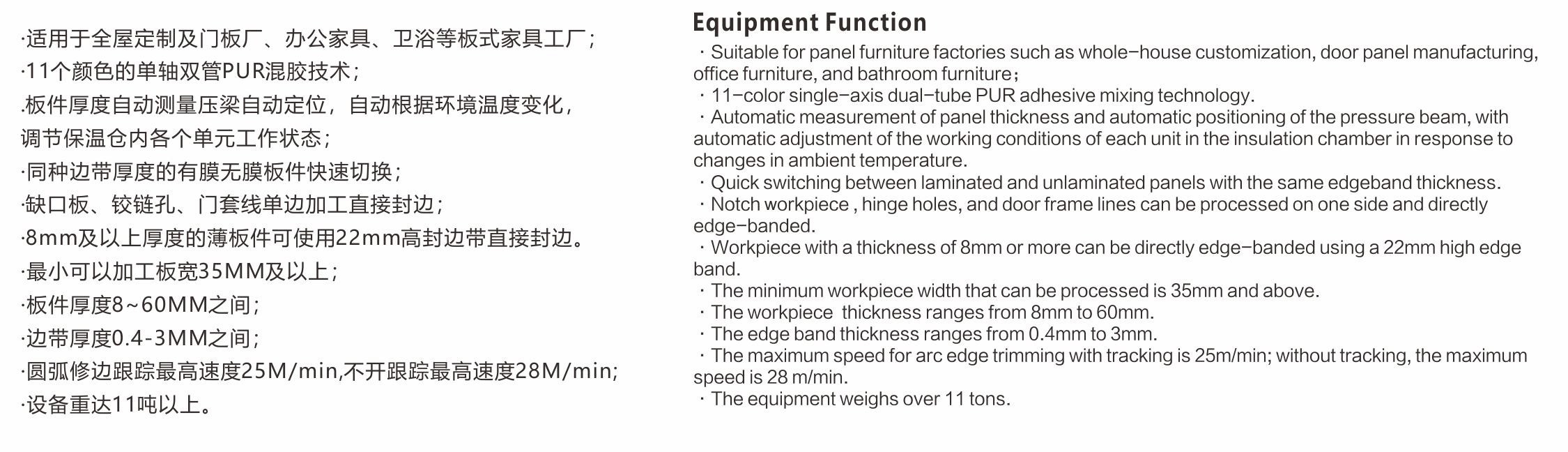 ·适用于板式全屋定制及办公家具工厂门板、柜体的PVC、ABS、亚克力、木皮等封边材质,宽度在35MM及以上,厚度8~60MM之间的板件加工。 ·自动测量调节压梁高度,板件基材待涂胶面彻底清理后涂胶,避免涂胶轴上频繁出现残渣导致涂胶不均匀从而影响封边效果;送带和压贴伺服驱动各个单元工作精度高,修边、刮刀、平铲单元垂直伺服调节,能够实现封边带厚度误差的垂直加工量的快速校正,有膜无膜板件快速切换及不同膜厚度的快速自动补偿。加工速度最高可达28M/min,重型四刀跟踪最高速度可达25米M/min,可以一次完成板件的圆弧直线封边和后续打蜡抛蜡保护。 ·自带恒温房的激光封边系统,免去客户自己搭空调房的高能耗、高成本及移动设备位置改变空间布局的不便,同时减少占地空间,可以实现对激光封边带的无缝封边完美加工。 ·一组单轴双管多色PUR专用免清洗涂胶系统,可以根据不同的板件基材快速自动调节对应合适涂胶量,具备夏季胶水快速降温,冬季板材、胶水、封边带及加工过程自动加温保温功能,为 PUR 不同气候温度下正常工作保驾护航。 ·机架采用加厚钢板焊接制作,经过退火铣平处理,上下钢梁且下钢梁及导轨与机身一体化设计精度更高,单元设计重型化长期工作稳定性更高,拥有多项国家专利技术,电气零部件采用国际国内知名品牌,保证设备运行持续稳定,加工品质完美。 ·重达11吨以上的重型设备。