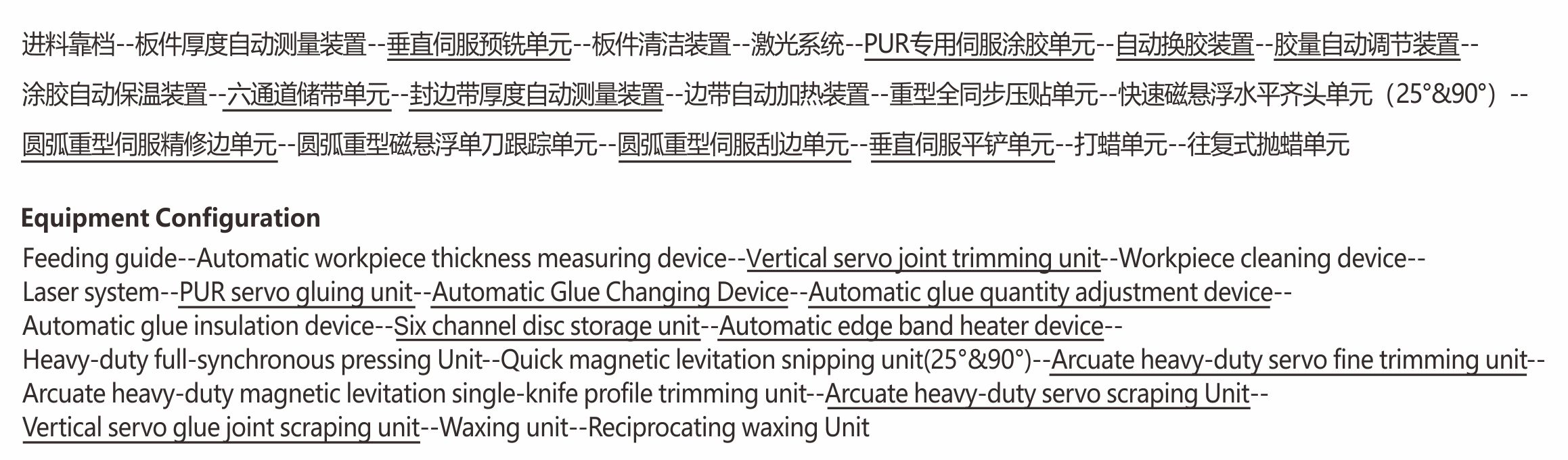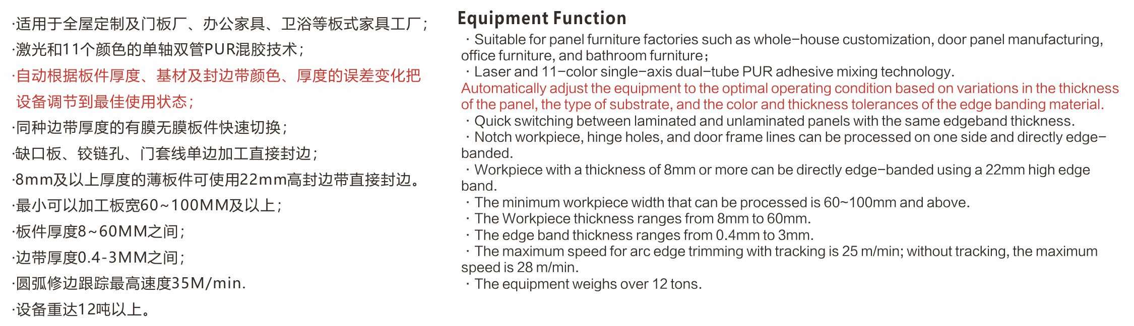 ·适用于板式全屋定制及办公家具工厂门板、柜体的 PVC、ABS、亚克力、等封边材质,宽度在 60MM~100mm 以上,厚度 8~60MM 之间板件。 ·自动测量板件厚度误差变化,调节最合适的压梁高度;封边带厚度自动测量,根据封边带厚度误差变化自动调节修边、跟踪、刮刀各个单元刀具的加工量;预铣单元刀具伺服自动升降,大大提高了预铣刀使用寿命和工作效率;送带、压贴伺服驱动,压带、修边、跟踪、刮刀、平铲等单元伺服快速调节。板件基材待涂胶面彻底清理后涂胶,避免涂胶轴上频繁出现残渣导致涂胶不均匀从而影响封边效果,送带压贴各个单元工作精度高,有膜无膜板件快速切换及不同膜厚度的快速自动补偿。高速磁悬浮水平齐头加工精度更高的同时能够实现90度及25度倒棱锯切,磁悬浮跟踪刀刃双向伺服调节精度更高,加工速度最高可达35M/min,可以一次完成板件的圆弧直线封边和后续打蜡抛蜡保护。 ·自带恒温房更加节能先进的第二代豪田激光封边系统,免去客户自己搭空调房的高能耗、高成本及移动设备位置改变空间布局的不便,同时减少占地空间,可以实现对激光封边带的无缝封边完美加工。 ·一组单轴双管多色PUR专用伺服免清洗涂胶系统,可以根据封边带的颜色变化自动切换最合适的胶水颜色,根据不同基材的变化实时调节涂胶量大小。具备夏季胶水快速降温,冬季板材、胶水、封边带及加工过程加温保温功能,为PUR不同气候温度下正常工作保驾护航。 ·机架采用加厚钢板焊接制作,经过退火铣平处理,上下钢梁且下钢梁及导轨与机身一体化设计精度更高,单元设计重型化长期工作稳定性更高,拥有多项国家专利技术,电气零部件采用国际国内知名品牌,保证设备运行持续稳定,加工品质完美。 ·重达12吨以上的重型设备。