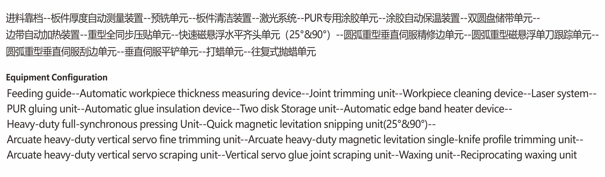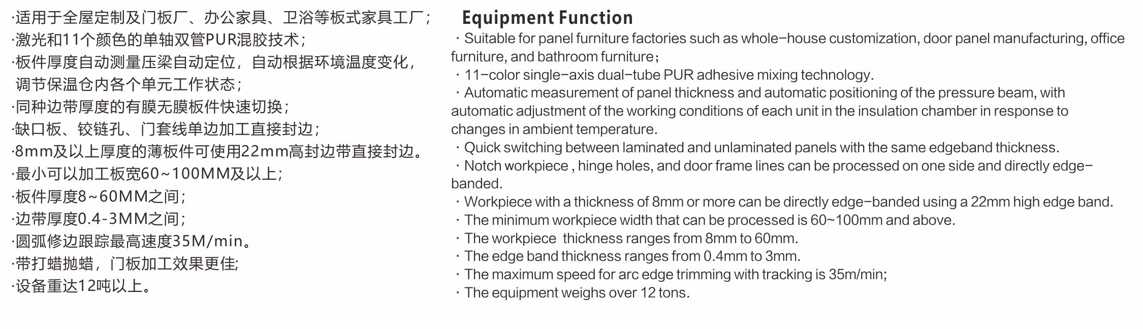 ·适用于板式全屋定制及办公家具工厂门板、柜体的 PVC、ABS、亚克力、等封边材质,宽度在 60MM~100mm 以上,厚度 8~60MM 之间板件。 ·自动测量调节压梁高度,板件基材待涂胶面彻底清理后涂胶,避免涂胶轴上频繁出现残渣导致涂胶不均匀从而影响封边效果;送带和压贴伺服驱动各个单元工作精度高,修边、刮刀、平铲单元垂直伺服调节,能够实现封边带厚度误差的垂直加工量的快速校正,有膜无膜板件快速切换及不同膜厚度的快速自动补偿。高速磁悬浮水平齐头加工精度更高同时能够实现90度及25度倒棱锯切,磁悬浮跟踪刀刃双向伺服调节精度更高,加工速度最高可达35M/min,可以一次完成板件的圆弧直线封边和后续打蜡抛蜡保护。 ·自带恒温房的激光封边系统,免去客户自己搭空调房的高能耗、高成本及移动设备位置改变空间布局的不便,同时减少占地空间,可以实现对激光封边带的无缝封边完美加工。 ·一组单轴双管多色PUR专用免清洗涂胶系统,可以根据不同的板件基材快速自动调节对应合适涂胶量,具备夏季胶水快速降温,冬季板材、胶水、封边带及加工过程自动加温保温功能,为 PUR 不同气候温度下正常工作保驾护航。 ·机架采用加厚钢板焊接制作,经过退火铣平处理,上下钢梁且下钢梁及导轨与机身一体化设计精度更高,单元设计重型化长期工作稳定性更高,拥有多项国家专利技术,电气零部件采用国际国内知名品牌,保证设备运行持续稳定,加工品质完美。 ·重达12吨以上的重型设备。
